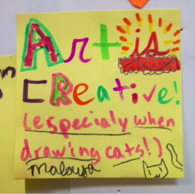 On the first day of class, I gave upper grades a post-it and asked them to think about what Art meant to each of them. One at a time they shared their answer and added their post-it to our wall.